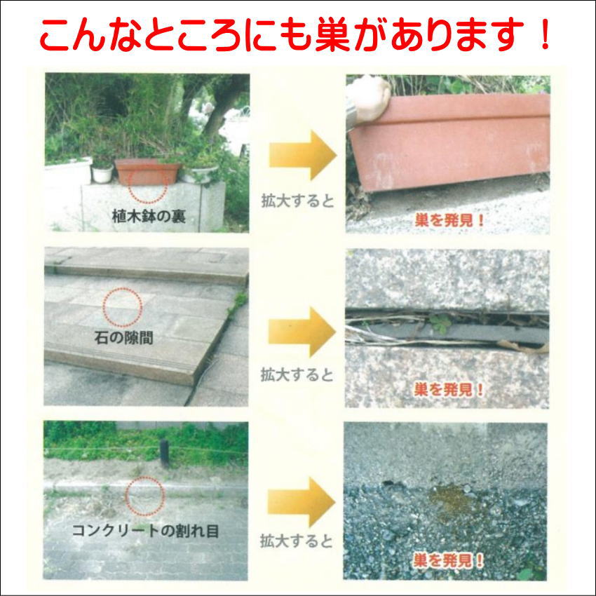 クロアリが発生している所に直接散布するか、植木鉢、枯葉、石垣の間、木の割目などクロアリの営巣、生息発生しやすい所に散布して下さい。家屋への侵入を防止するには、進入の経路となる床下、基礎の周囲、外壁などに散布して下さい。