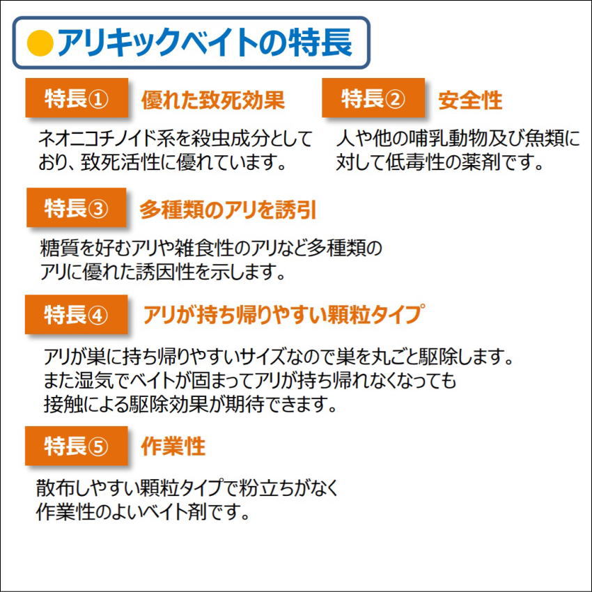 巣に持ち帰らせることにより駆除効果を発揮します。湿気でベイトが固まってアリが持ち帰れなくなっても接触による駆除効果が期待できます。散布しやすい顆粒タイプなので粉立ちがなく作業性のよいベイト剤です。