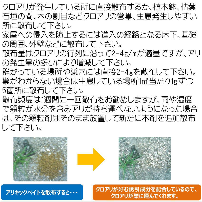 散布頻度は1週間に一回散布をお勧めしますが、雨や湿度で顆粒が水分を含みアリが持ち運べないようになった場合は、その顆粒剤はそのまま放置して新たに本剤を追加散布して下さい。