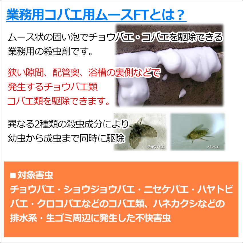コバエ・チョウバエ専用駆除剤です。排水口やトイレ、厨房・台所の配管奥にムースが届き、奥で発生するチョウバエ・コバエ類を発生源から駆除