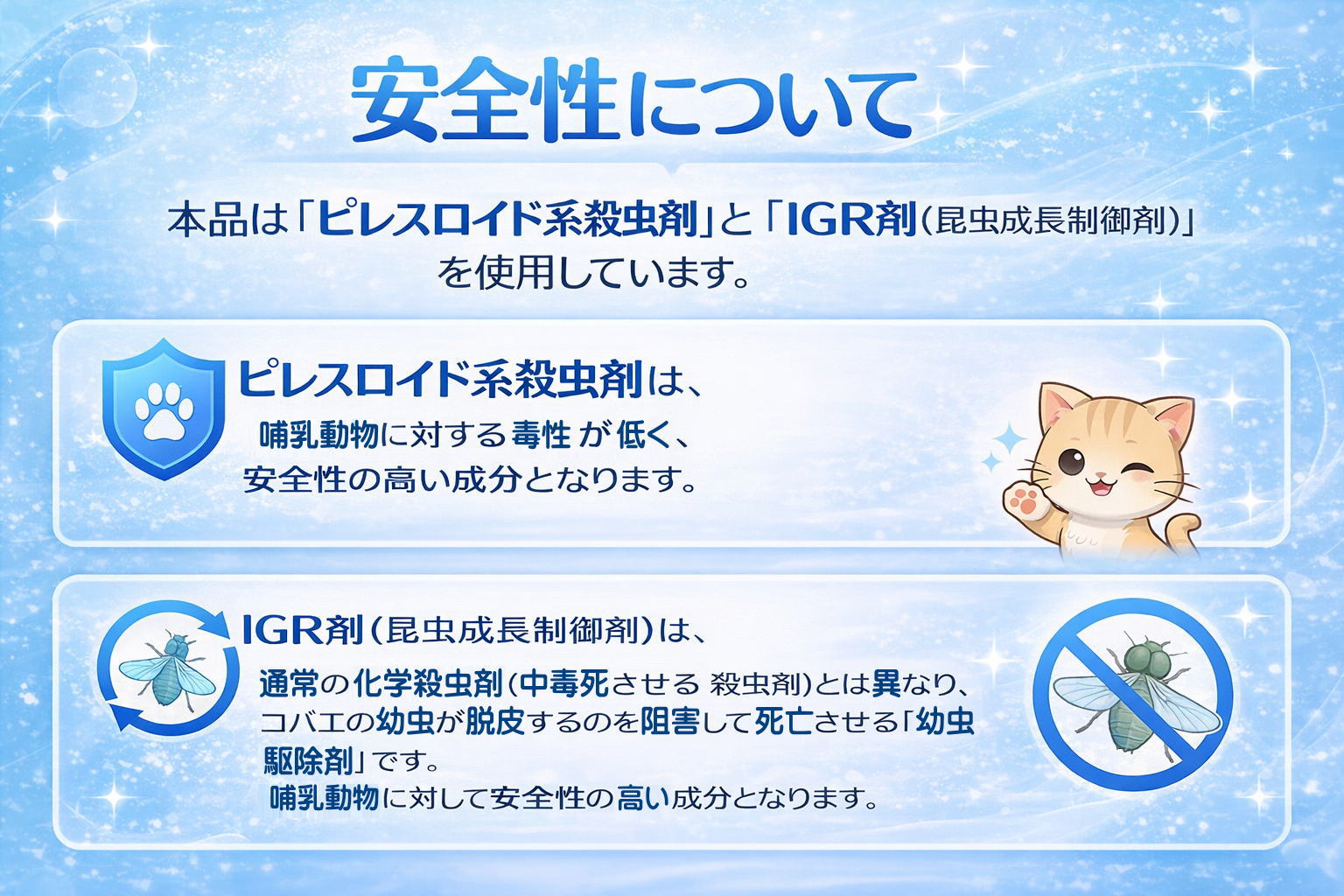 ・ピレスロイド系殺虫剤は、哺乳動物に対する毒性が低く、安全性の高い成分となります。