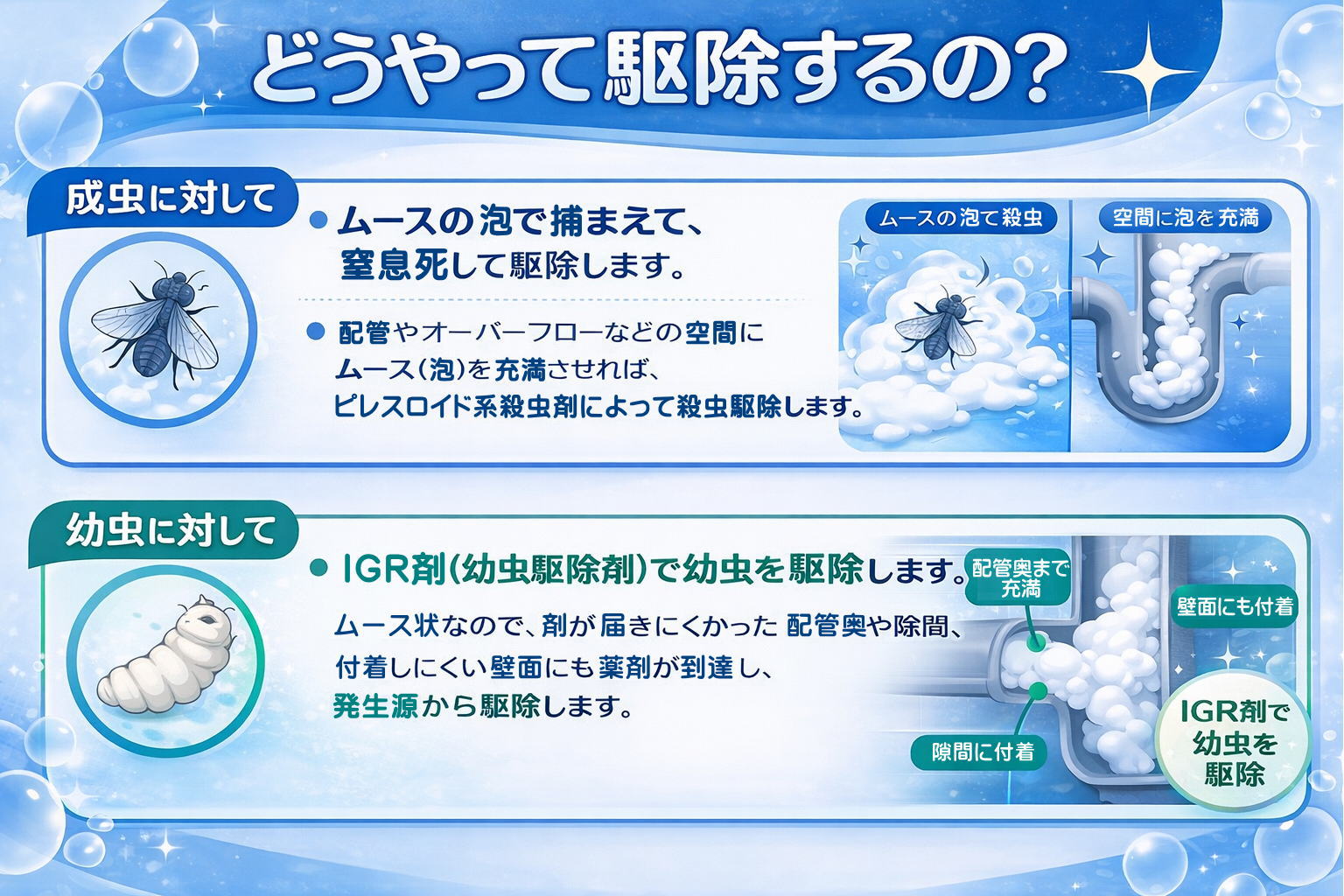 ・配管やオーバーフローなどの空間にムース(泡)を充満させれば、ピレスロイド系殺虫剤によって殺虫駆除します。