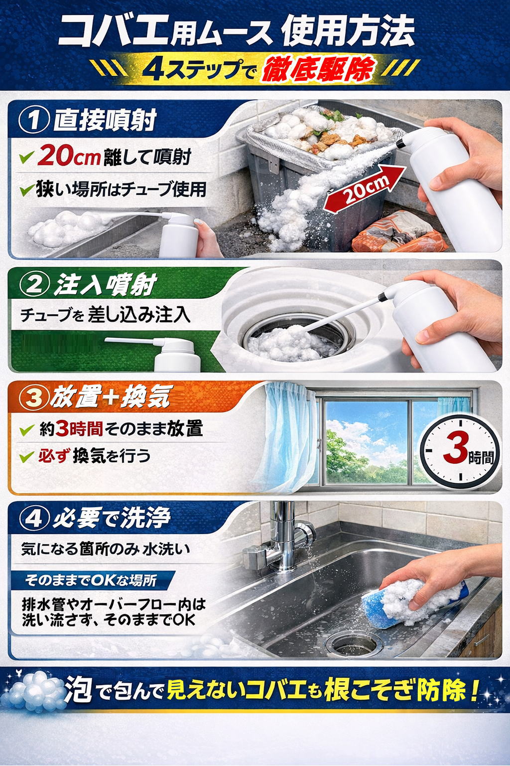 ※泡には可燃性ガスを使用しているため、ガスが滞留しないよう、数時間は換気をしてください。