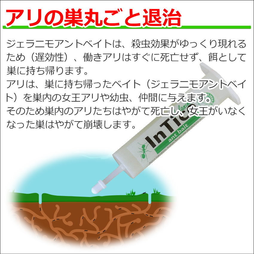 ジェラニモアントベイトは、殺虫効果がゆっくり現れるため(遅効性)、働きアリはすぐに死亡せず、餌として巣に持ち帰ります。