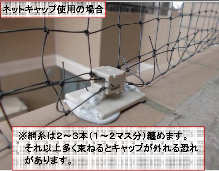 貼付け後にネットキャップやインシュロックなどでネットを簡単に固定する事ができます。